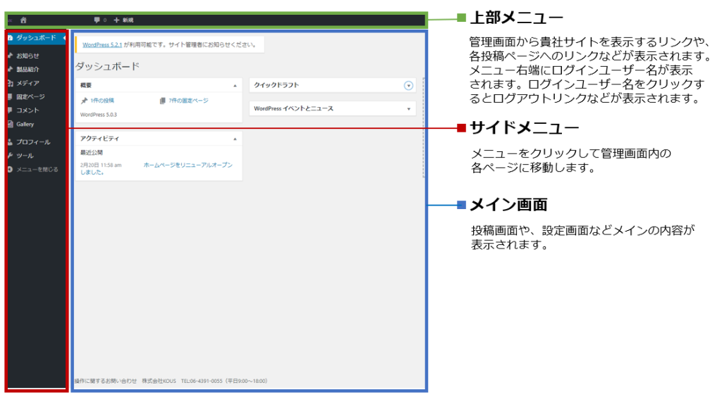 管理画面から貴社サイトを表示するリンクや、各投稿ページへのリンクなどが表示されます。