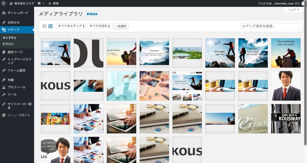 左サイドメニュー「メディア」をクリックすると、アップロードした画像などのメディアファイル一覧が表示されます。ここでは、メディアの追加(アップロード)、削除、編集が行えます。
