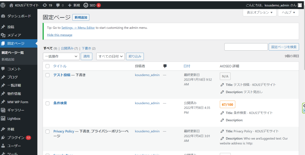 固定ページの表示について(テンプレート) テンプレートプランに関しては、コンテンツの編集・追加・削除についてはサイドメニューから「固定ページ」を開いて頂き、すべてのページ編集が可能です。 多くはテーブルの内容変更が含まれますので、詳しくはこちらをご参照ください。