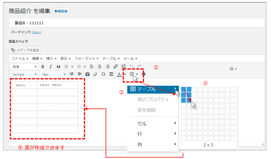 ③サブメニュー表示されたマス目の上で作成したい表の形式にあわせて、ドラッグし、必要な数のセルを作成します。