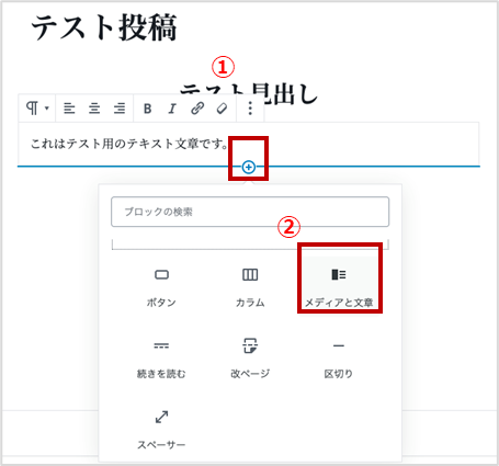 ②ブロックの一覧から「メディアとテキスト」を選択すると「メディアエリア」が挿入されます。