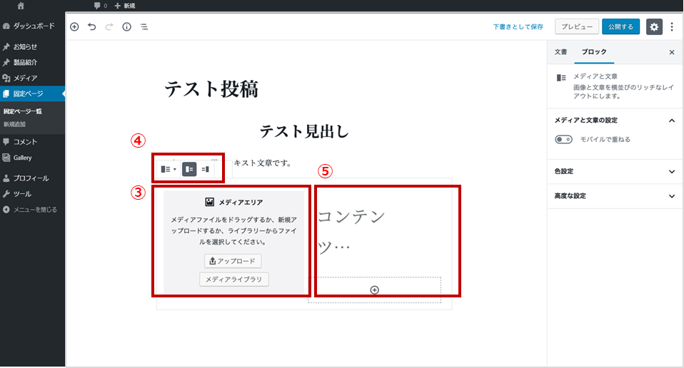 ⑤右のブロック(コンテンツ…)にテキストを入力します。