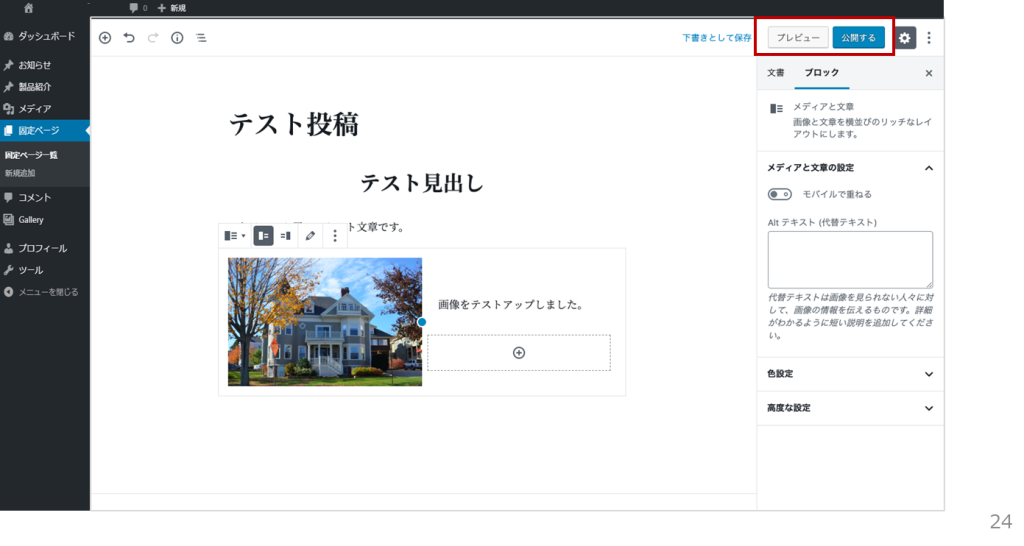 最後に、画面右上の「公開する」ボタンをクリックして記事を公開します。「プレビュー」ボタンをクリックすると、公開前に表示を確認できます。