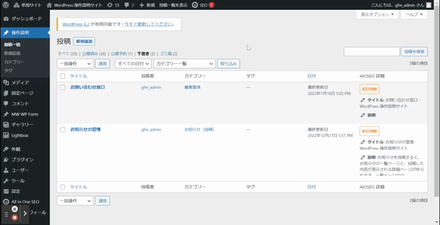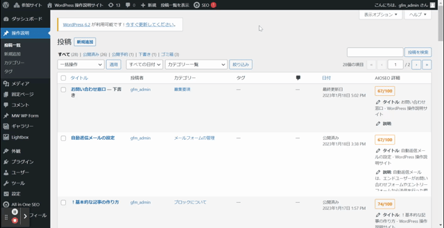 ①投稿内に「すべて」「公開済み」「公開予約」「下書き」「ゴミ箱」の分類があります。